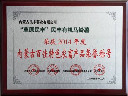 此次評選活動自北方新報、正北方網、《北方新報》官方微信公布推選產品以來,來自全區各地11.2萬人次的消費者對112家企業的539種推選產品進行了投票。最終,經過自治區農牧業廳、內蒙古食品藥品監督管理局、內蒙古龍頭企業協會的專家結合企業報名材料、企業年檢記錄、產品檢驗報告及消費者投票等多項內容,推選出了120種內蒙古百佳特色農畜產品名單。我公司“草原民豐”有機馬鈴薯榮獲2014年度內蒙古百佳特色農畜產品榮譽稱號。
